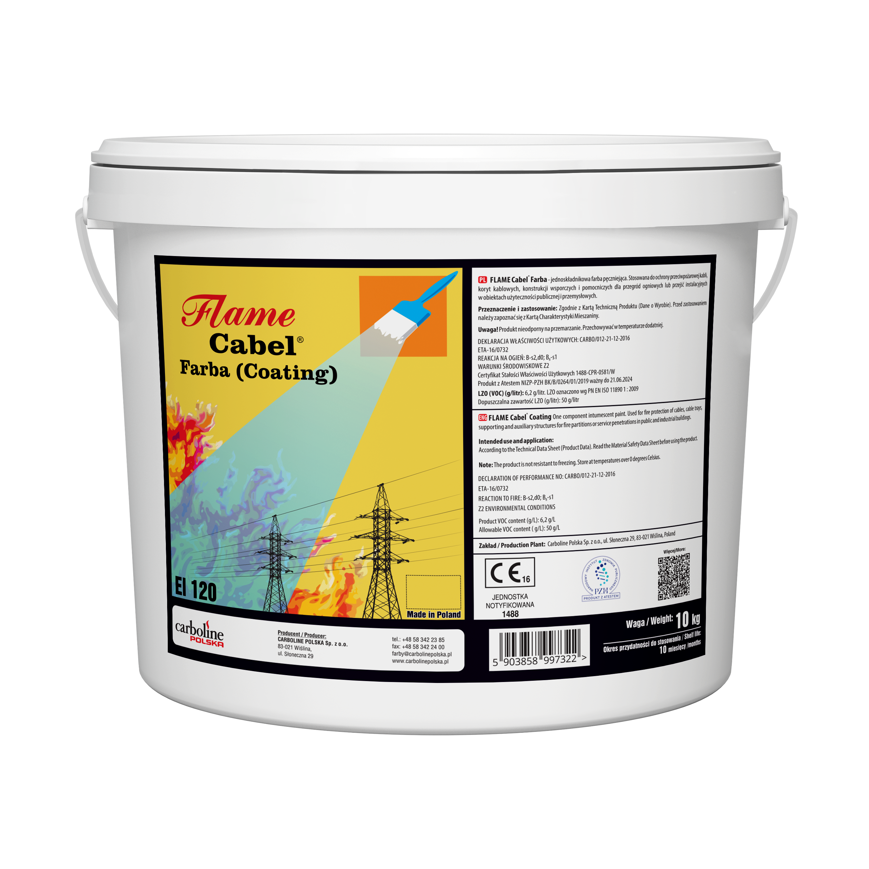 FLAME CABEL FARBA przeznaczona jest do ochrony przeciwogniowej kabli, koryt kablowych, konstrukcji wsporczych i pomocniczych dla przegród ogniowych lub przejść instalacyjnych w obiektach użyteczności publicznej i przemysłowych.