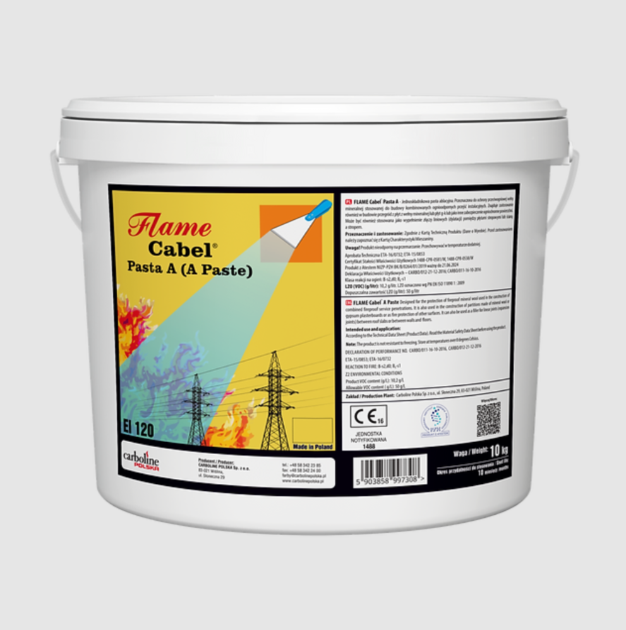 Proponowane przez Carboline Polska Sp. z o.o. zabezpieczenie ogniochronne kabli doskonale sprawdzi się zarówno w przypadku podnoszenia odporności ogniowej niewielkich złącz i konfiguracji elektrycznych, jak również podczas zwiększania bezpieczeństwa rozbudowanej sieci przewodów. Ochrona przeciwpożarowa kabli to nie tylko większe bezpieczeństwo instalacji, ale również ograniczenie ryzyka zwarcia i rozprzestrzeniania się ognia w przypadku zaistniałego zagrożenia. Proponowane przez nas zabezpieczenie ogniochronne instalacji to preparaty i rozwiązania niezwykle proste w aplikacji oraz skuteczne w działaniu. Posiadają niezbędne atesty i Aprobaty Techniczne, które potwierdzają ich wysoką jakość i bezapelacyjną skuteczność. Nie mamy najmniejszych wątpliwości co do tego, że skuteczna ochrona przeciwpożarowa przewodów przełoży się na podniesienie standardów bezpieczeństwa dla całego budynku bądź konstrukcji. Wśród licznych, proponowanych przez nas rozwiązań znajduje się m.in. pasta ablacyjna. Przeznaczona jest do malowania płyt lub mat z wełny mineralnej do budowy kombinowanych ognioodpornych przejść instalacyjnych. Używa się jej również do budowy przegród z płyt z wełny mineralnej lub płyt k-g jako wypełnienie złącz pomiędzy kawałkami płyt lub uszczelnienia wolnych przestrzeni pomiędzy powierzchniami rur a płytami wełny. Flame Cabel Pasta A może być stosowana do uszczelniania rur izolowanych wełną mineralną przechodzących przez ściany lub stropy. Świetnie nadaje się również do wykonywania złącz liniowych które zostały wypełnione np. wełną mineralną lub pianką PYROPLEX. Można stosować do uszczelniania powierzchni żelbetowych lub wykonanych z cegły, gazobetownu, gipsu, wełny mineralnej itp. Klasa środowiska pracy: Z1, Z2.