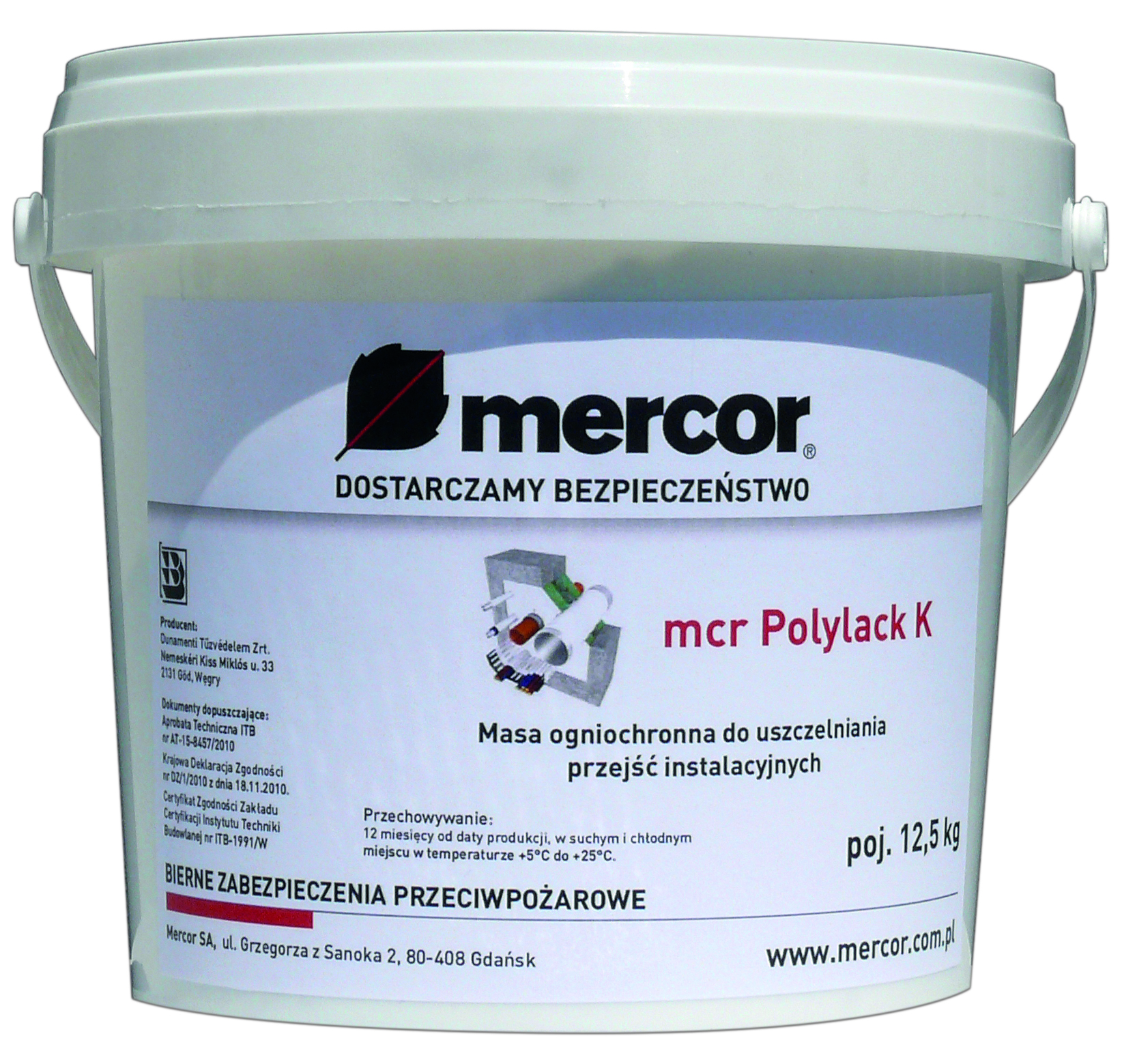 mcr Polylack K jest pęczniejącą masą w postaci gęstej szpachli. Po naniesieniu w postaci powłoki lub wypełnienia, przy oddziaływaniu wysokiej temperatury masa tworzy na powierzchni termoizolacyjną pienistą warstwę węglową, która zatrzymuje palenie się polimerowej powłoki izolacyjnej we wczesnym stadium i zapobiega rozprzestrzenianiu się płomienia na zabezpieczonej powierzchni.