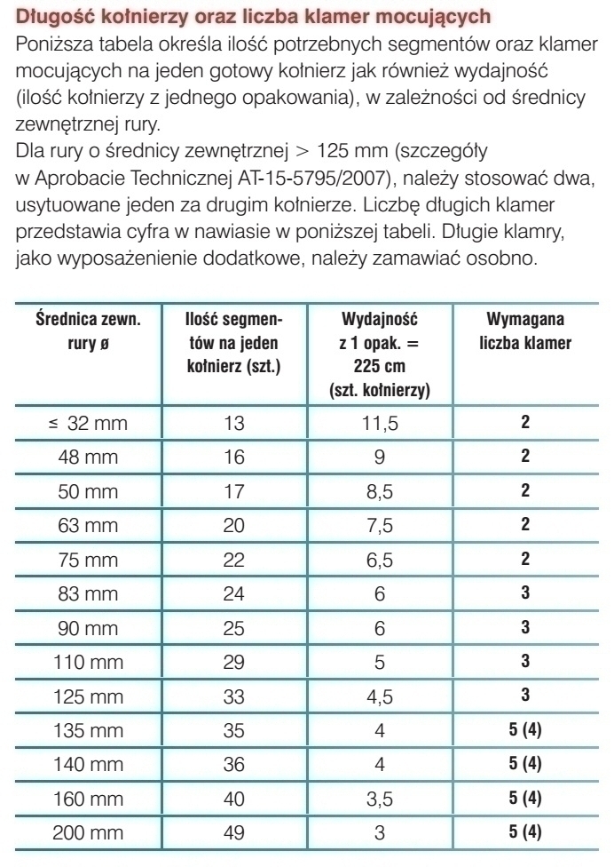 Tabela znajdująca się na opakowaniu (patrz: tabela przy zdjęciu produktu) pomaga w doborze wymaganej długości kołnierza.
